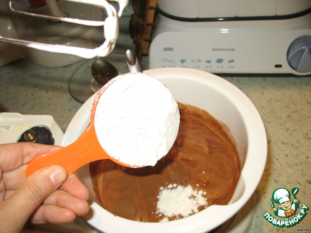 Добавить муку. Аккуратно смешать ингредиенты.