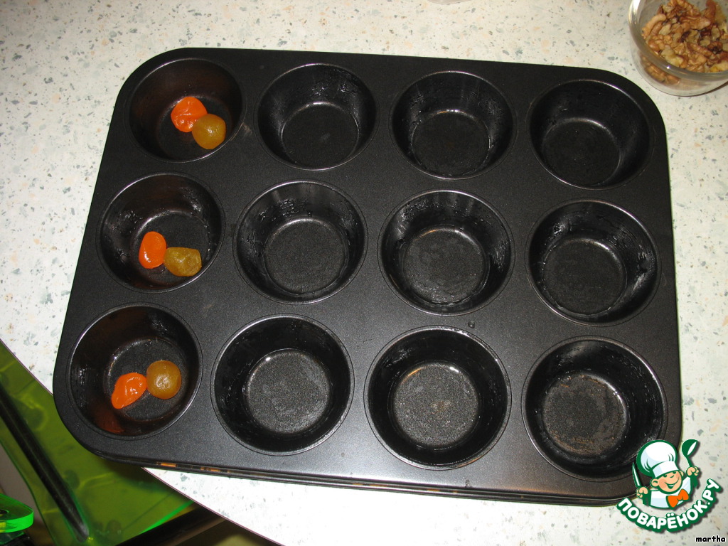В свои кексы (перед выкладываем теста в форму)я добавляю кусочки шоколада - режу шоколад на небольшие фрагменты (примерно размер изюма). Вы же можете добавить 50 гр грецких или иных орехов, цукаты (на одном из шагов видны цукаты - это мини-мандарины и мини-лимоны), изюм и пр. Это уже - кому что нравится.