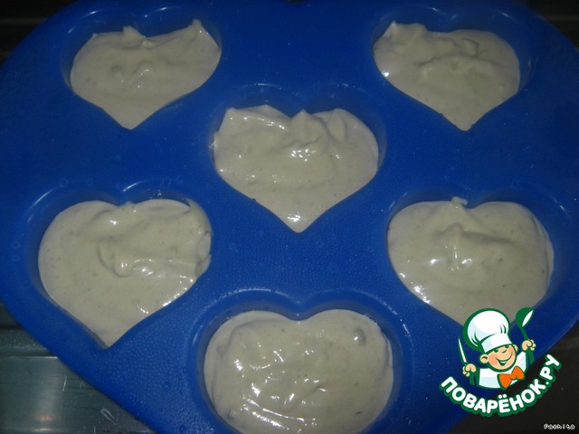 Кладем тесто в формочки (оставляя немного места, так как тесто поднимется).