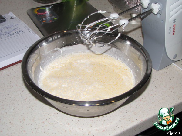 Вмешать в массу по одному яйцу, молоко и сливочное масло, после каждого положенного продукта доводя до однородности.