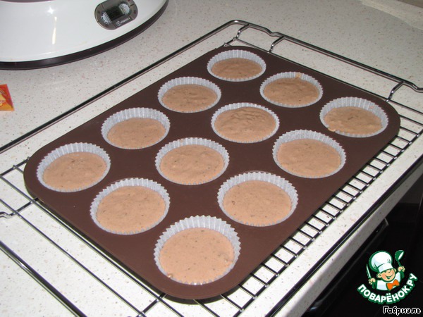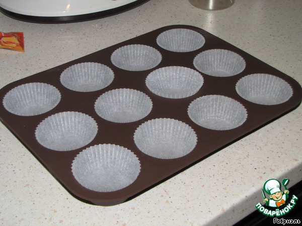 Форму для маффинов проложить бумажными формочками, духовку нагреть до 175 градусов.
