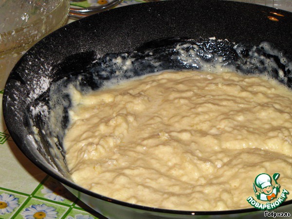 Влить яичную смесь к смеси мучной и СЛЕГКА перемешать, не добиваться однородности, главное - чтобы намокла вся мука.