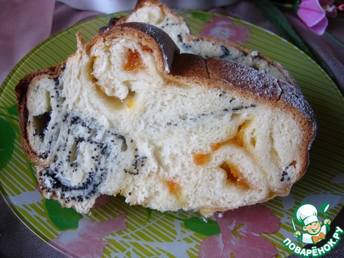 Затем снова творожно-маковые и снова абрикосовые. Закрыть сверху маковыми рулетиками швами вниз (!)и слегка всё прижать. Накрыть полотенцем и поставить на 15 -30 минут в тёплое место для того, чтобы тесто подошло)