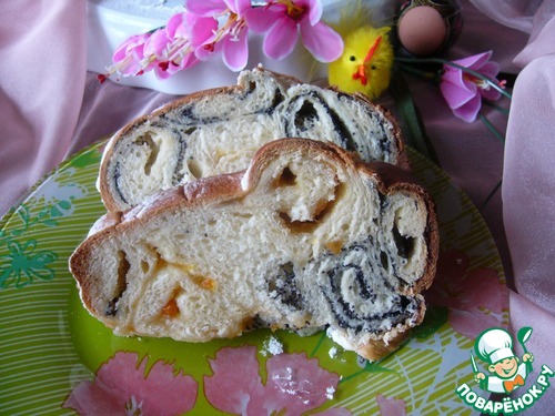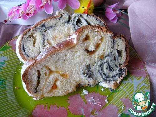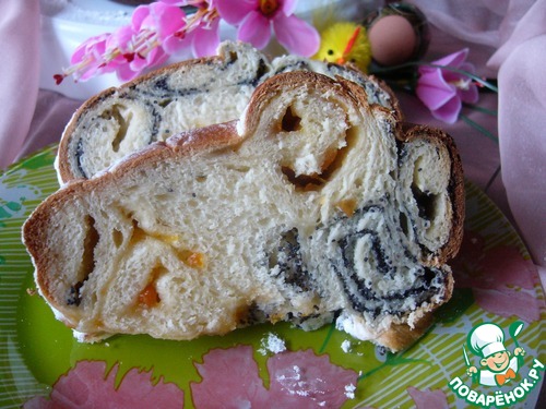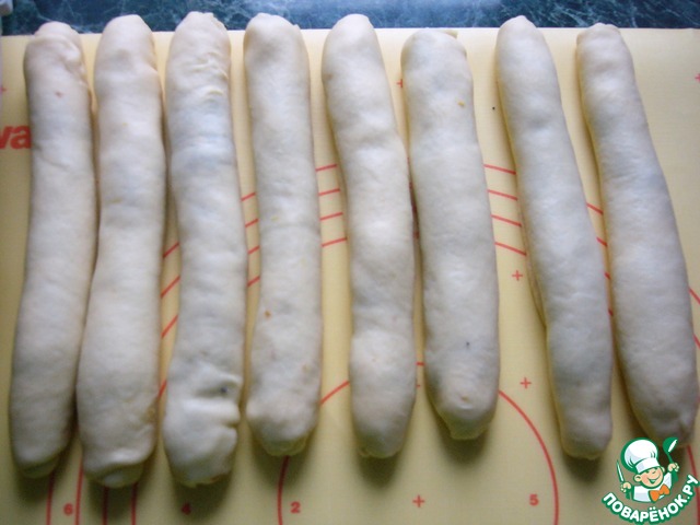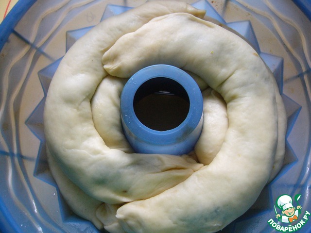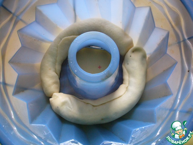 В форму, хорошо смазанную маслом (у меня размер 23 см на 11 см) выложить в низ 2 рулетика с творожно-маковой начинкой, стыкуя края и укладывая швом вверх (!)