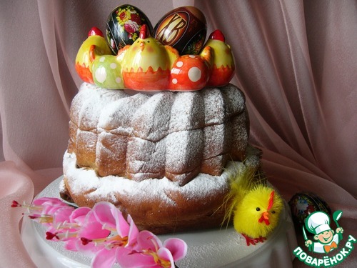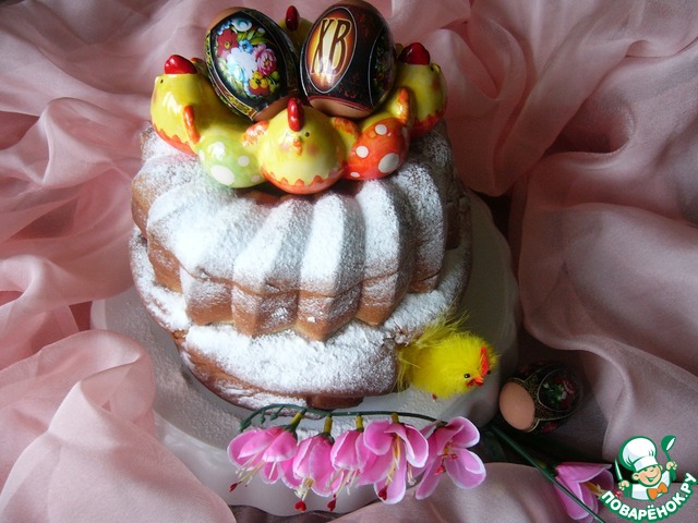 Готовый кекс достать из формы, остудить и посыпать сахарной пудрой. Сверху установить подставку с пасхальными яйцами