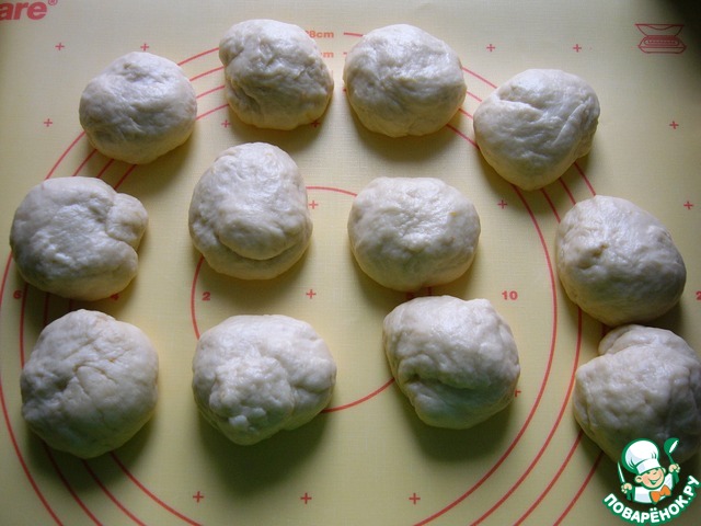 Разделить тесто на 12 одинаковых кусочков (примерно по 85-87 г каждый), скатать шарики, накрыть полотенцем и быстро приготовить творожную начинку