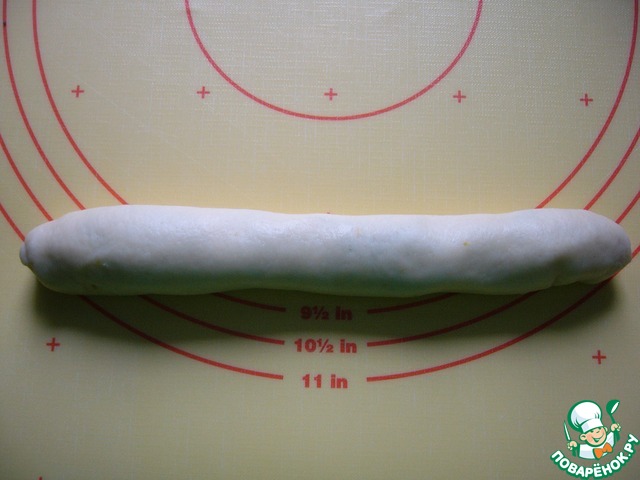 После сигнала тесто выложить на рабочую поверхность (у меня коврик для раскатки теста), хорошо его обмять, выпукая из него лишний воздух. Тесто очень гладкое, не липнущее к рукам, и подсыпать муку во время формирования не нужно. Вот так оно выглядит после обминки
