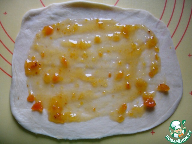 Теперь сделать рулетики с абрикосом из оставшихся кусочков теста. Раскатать, выложить 1 ст. л. протёртого абрикоса и равномерно распределить, оставляя по краям по 1 см