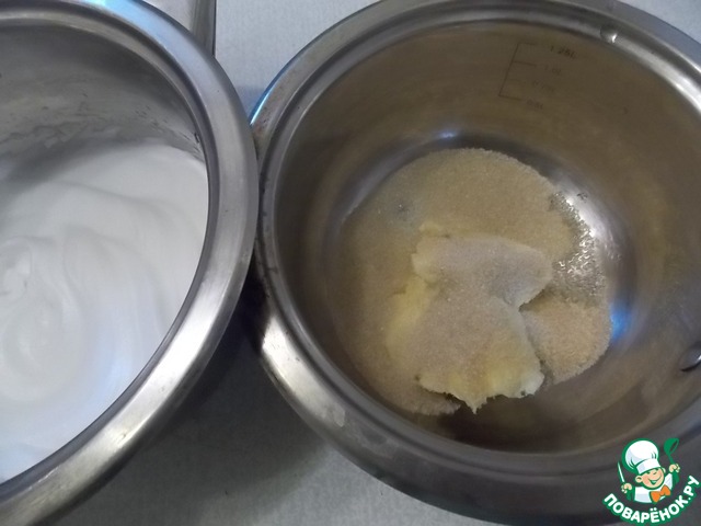 Белки отделить от желтков и взбить до твердых пиков. В размягченное масло положить сахар и взбить добела.