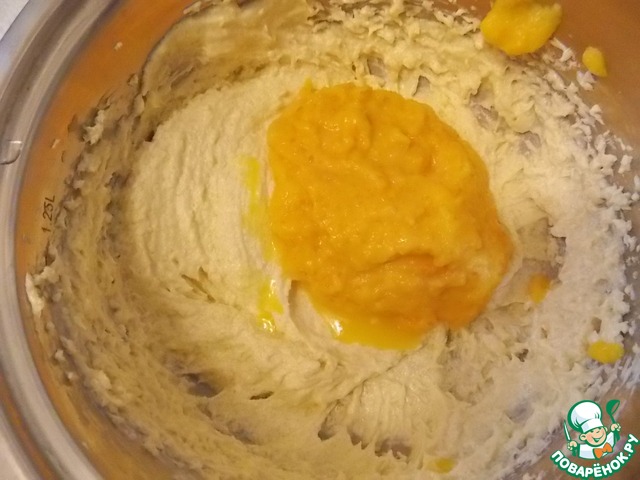 Во взбитое масло положить желтки. Взбить. Положить мандариновое пюре и еще немного взбить.