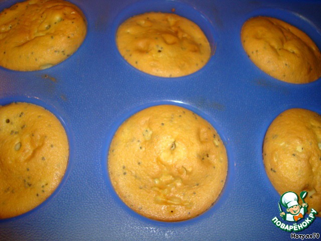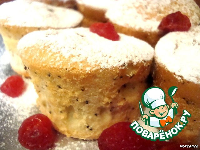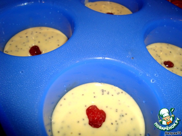 Наливайте тесто в формочки до половины - оно хорошо поднимается. В середину положите по вишенке. Можно и без вишни, как Вы понимаете. Если форма силиконовая - сбрызните ее водой. Если обычная - смажьте масло и припудрите мукой. Отправляйте в духовку. Маффины выпекаются очень быстро. У меня на это ушло 8 минут. Ориентируйтесь по своей духовке!