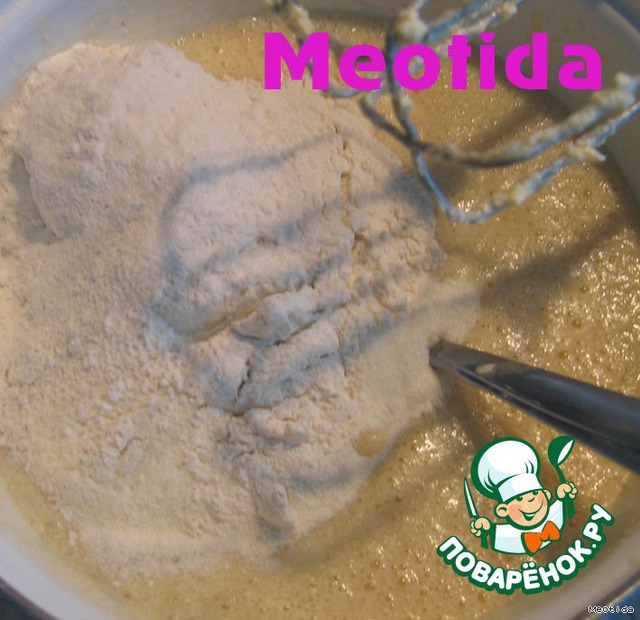 теперь всыпаем муку, сливки и разрыхлитель, все хорошенько взбиваем, до получения однородной кремообразной массы