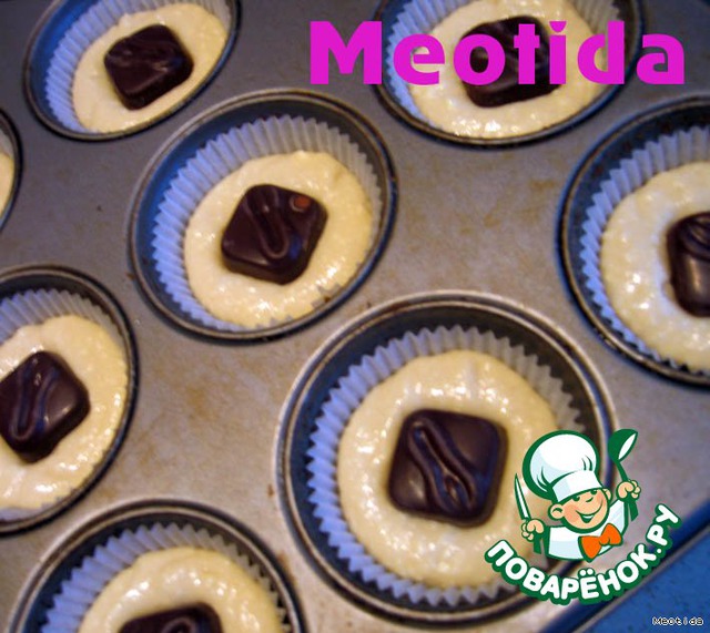 выкладываем в формочки по 1 ст.л. теста, в центр кладем по конфетке (у меня какие-то Бабаевские..можно брать любые!...даже те, ктороые просто так есть не хочется, потому что они не вкусные!)