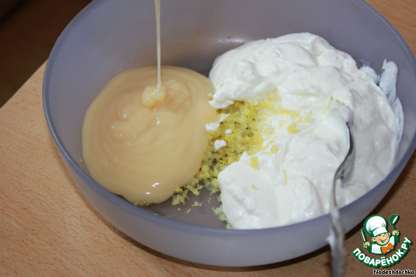 Рецептов бисквитного теста на сайте много и, наверняка, у каждой хозяйки рецепт свой. Я же хочу поделиться с хозяйками не только своим рецептом, но и своим способом украшения бисквита. Возможно, именно этот способ поможет вам в ситуации, когда бисквит осел, слегка подгорел или у вас попросту нет времени на шикарное оформление торта. Итак, я смешиваю сметану и сгущеное молоко (1:1), добавляю цедру лимона. Все тщательно перемешиваю и слегка взбиваю.