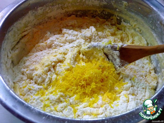 Просеять муку, смешать с содой и цедрой лимона. Аккуратно вмешать во взбитую (увеличится при взбивании в 2 раза и появятся пузырьки) массу. Добавить изюм и цукаты.
