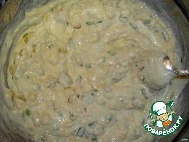 В емкости смешиваем блинную муку с простой, добавляем половину жареного лука, половину сыра и нарезанный зеленый лук, щепотку соли.