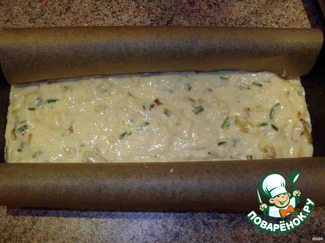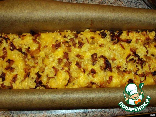 Выложить ровным слоем в форму, наверх на луковое тесто.