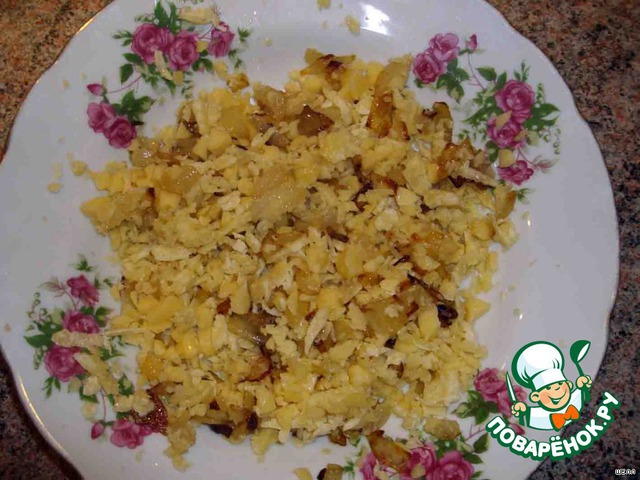 Натереть на терку замороженное тесто и быстро перемешать с оставшимся луком и сыром.