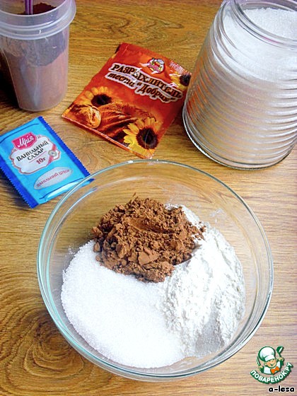 Муку просеять с разрыхлителем, добавить какао, сахар, ванильный сахар и тщательно перемешать.
