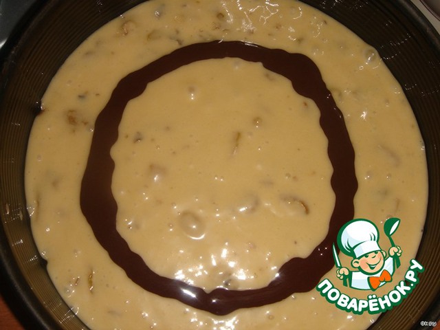 Развести 1 столовую ложку какао-порошка 1 столовой ложкой горячей воды, вылить полосой по всей окружности теста, дать слегка застыть.