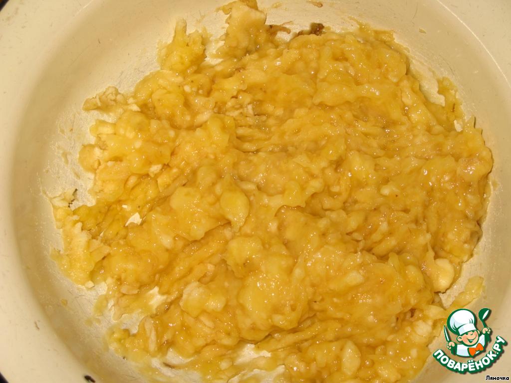 Масло растопить на плите или в микроволновой печи и сразу же добавить к бананам, перемешать деревянной ложкой до однородной массы.