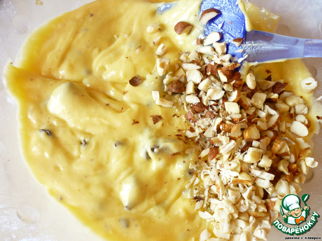 Готовим тесто: миксером взбиваем масло с сахаром, постепенно добавляя желтки. Муку смешиваем с разрыхлителем и частями вводим в тесто. Добавляем молоко, орехи и шоколад. Все хорошо перемешиваем.