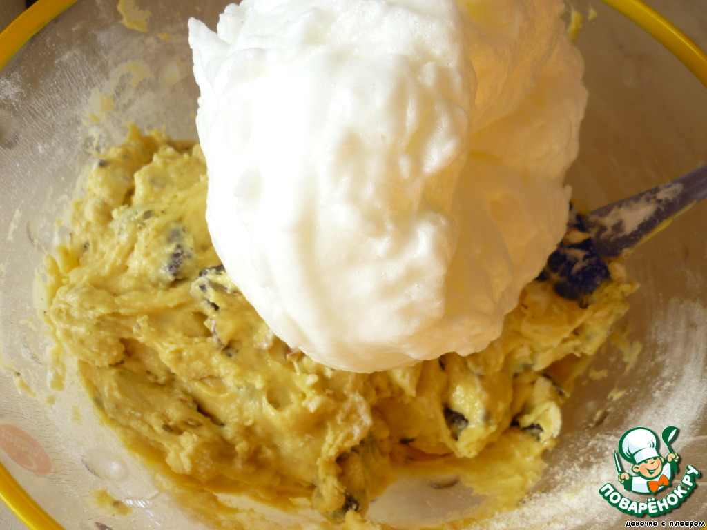 Белок с щепоткой соли взбиваем в тугую пену и аккуратно подмешиваем к тесту.