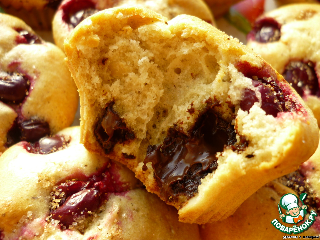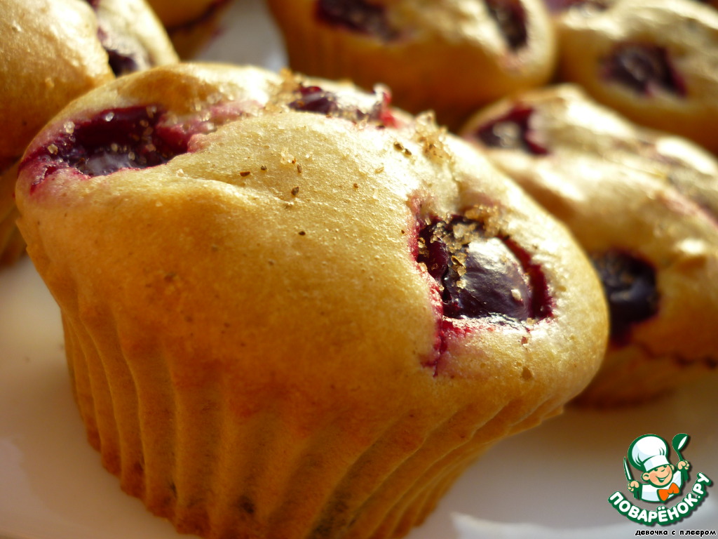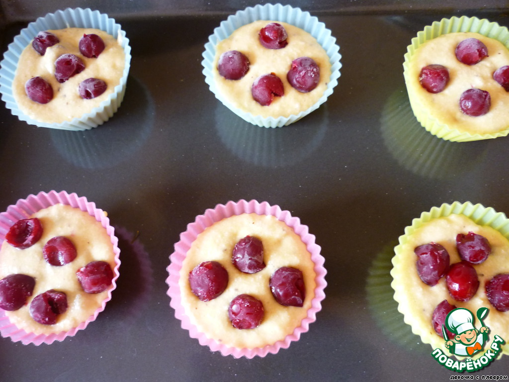 Готовое тесто выкладываем в формочки для маффинов на 2/3 от объема формочек. Сверху распределяем вишню, слегка ее утапливаем в тесте.