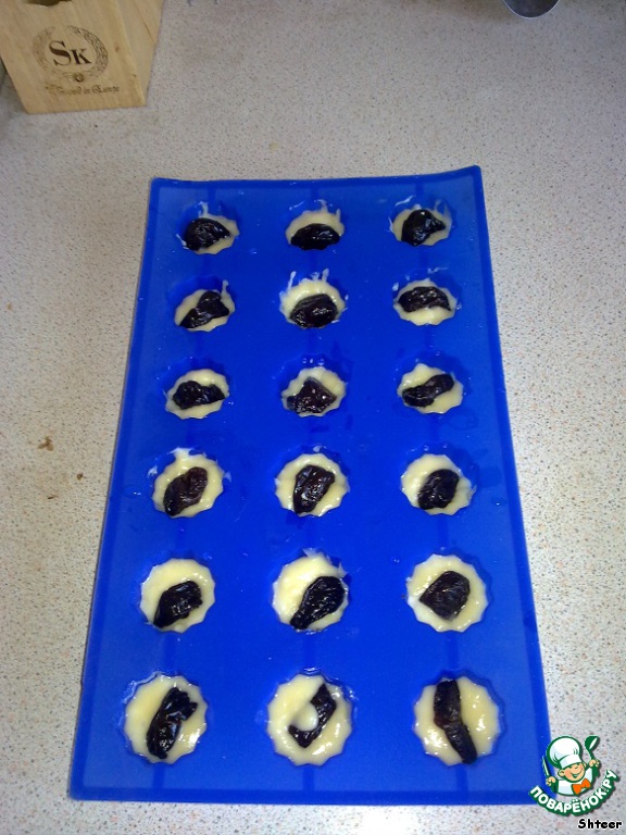 Начинаем формировать наши кексики. На дно формочки, смоченной водой, наливаем тесто. Тесто должно заполнять не больше одной трети от объема формы! Иначе ваши кексы "убегут". Затем "вставляем" по центру чернослив.