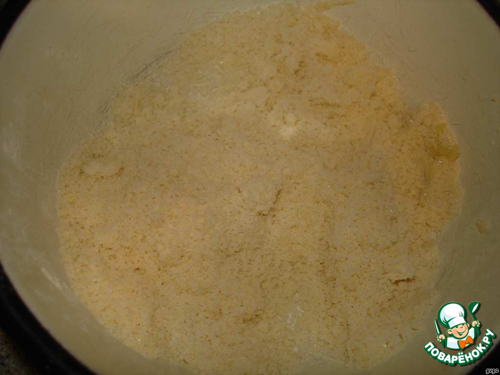 Делаем присыпку: сахар, масло и муку смешиваем и растираем до состояния крошки.