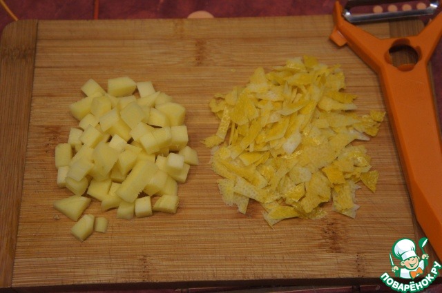 Ножом для чистки овощей срезать цедру лимона, нарезать ее кусочками произвольной формы. Имбирь очистить и нарезать кубиками.
