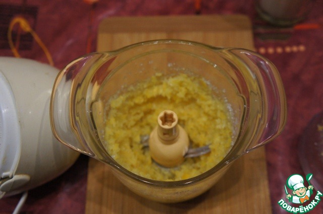 Измельчить цедру и имбирь вместе с 1/4 стакана сахара в комбайне или блендере в пасту.