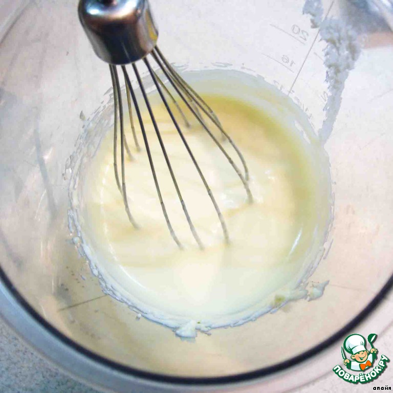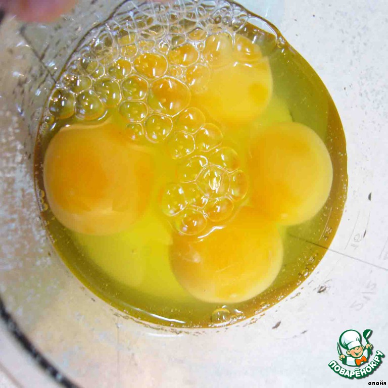 Поместила сахар в емкость для блендера и добавила яйца. Все тщательно взбила в пышную пену.