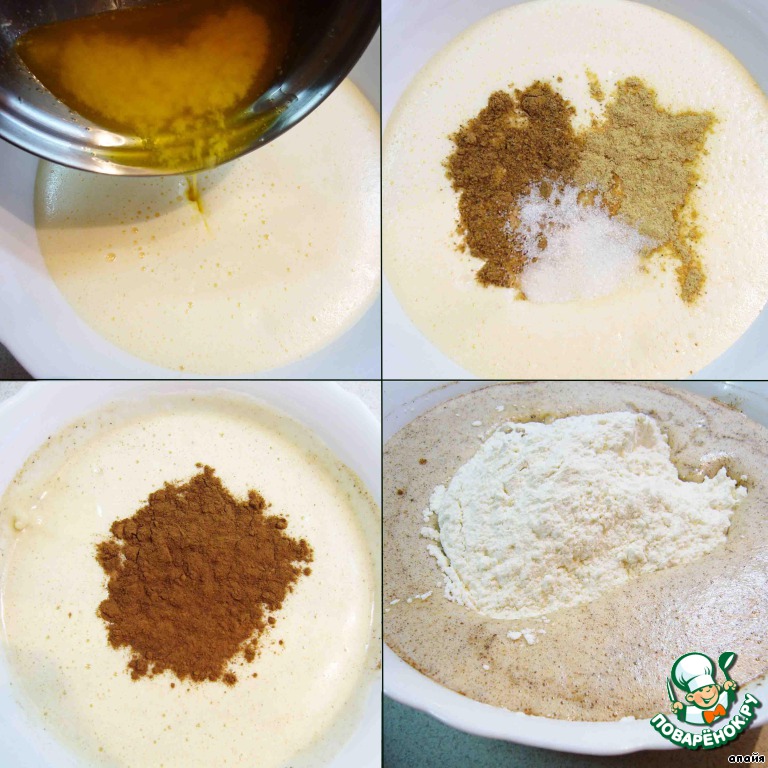Затем добавила растопленное масло, мускатный орех, имбирь и ванильный сахар. Хорошенько перемешала и добавила какао. Опять все перемешала и добавила муку с разрыхлителем. Тесто получилось воздушным и объемным.