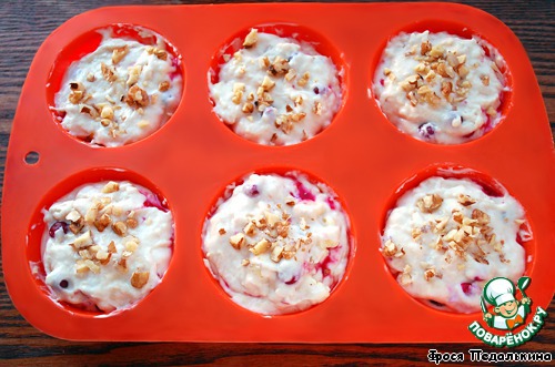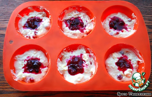 Наполнить формы для маффинов наполовину, сделать в центре небольшое углубление, положить в него по 1 ч.л. клюквенного джема.