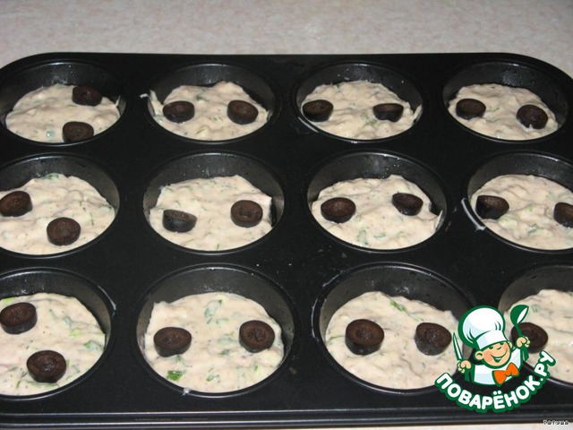 маслины разрезать пополам и слегка вдавить в тесто разрезом вверх. Выпекать при 180*C 20 минут.