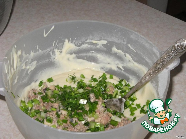 Яйца взбить, добавить йогурт, муку, соль и разрыхлитель. Перемешать до полужидкого теста, добавить рыбу с зеленью. Перемешать ложкой.