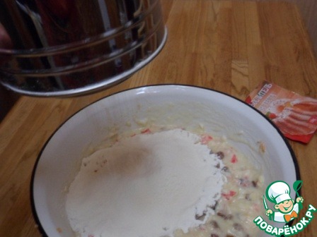 Муку смешать з разрыхлителем теста. Ввести, просеивая в манную массу.