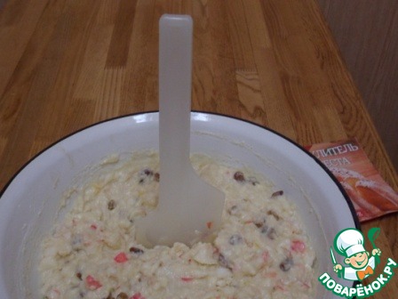 Хорошо премешать. Масса получится довольно густая (специально показала, что лопатка для перемешивания не падает).