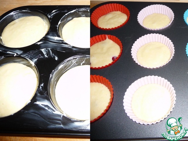 Формы для кексов смазать сливочным маслом, силиконовые не смазывать. Выкладываем тесто в формочки на ¾.