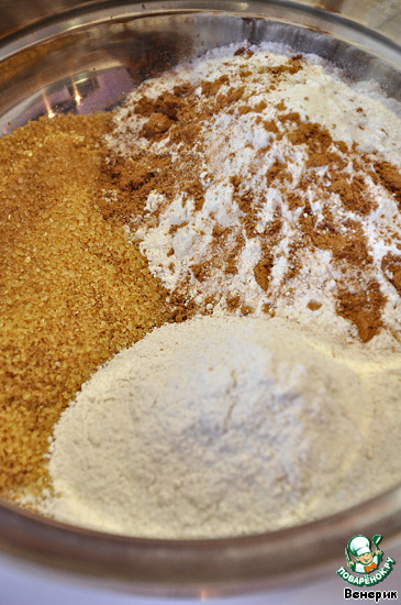 Смешать муку с разрыхлителем, солью, сахаром, молотой корицей.