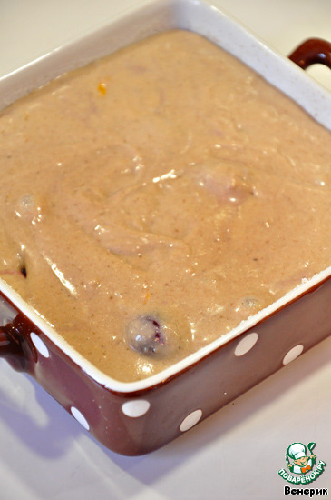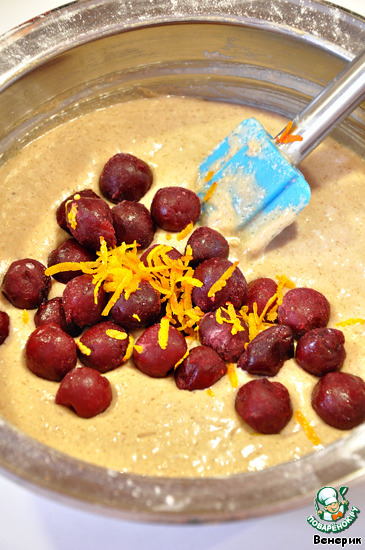 аккуратно добавить в муку, все перемешать, добавить цедру и ягоды (не размораживая), всё ещё раз перемешать, не взбивать, тесто должно быть немного комковатым из-за ягод.