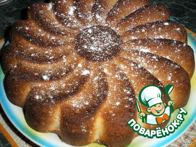 Остывший, выкладываем его на блюдо и посыпаем сахарной пудрой.