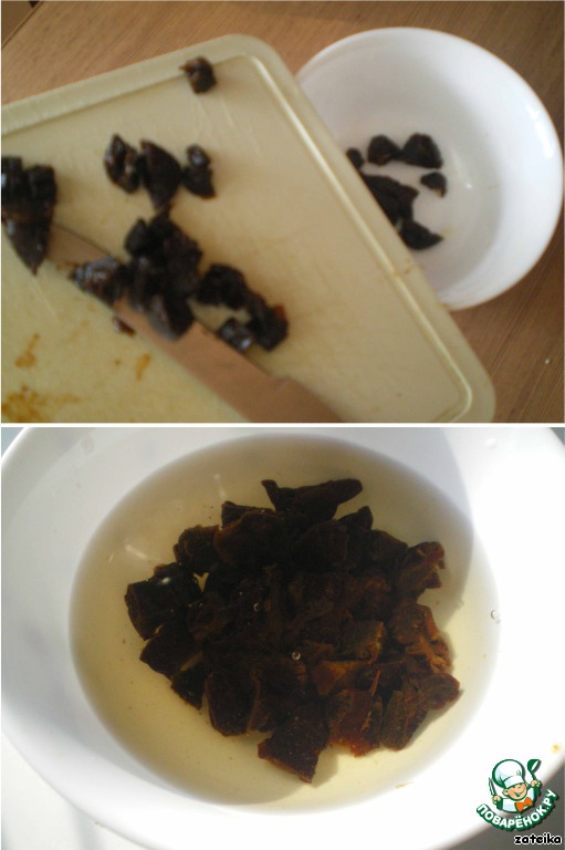 Первым делом чернослив моем, режем на мелкие кусочки, заливаем вином и оставляем минут на 30. Я использовала белое полусухое вино, а в принципе, можно любое. Если чернослив суховат, вино лучше подогреть, если очень сухой – то предварительно размочить его (чернослив) в воде.