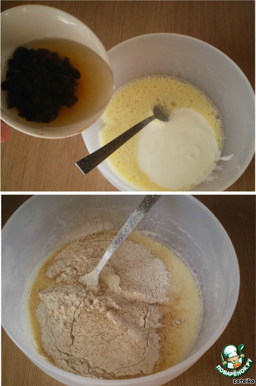 В посуде смешиваем слегка взбитое яйцо (если с диетой совсем уж жестко, то можно использовать только белок), кефир (или несладкий йогурт), сахар (количество сахара необходимо корректировать в зависимости от сладости вина: у меня полусухое – мне хватило столовой ложки, на сухое понадобится полторы), вливаем вино из-под чернослива. Затем всыпаем корицу и просеянную с разрыхлителем муку, тщательно вымешиваем тесто.