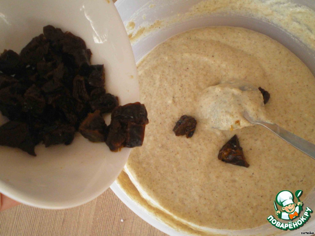 Тесто я обычно пробую на сладость, если надо, подсыпаю сахар, но осторожно, это же «легкие» кексы, они не должны быть сладкими, да и корица сделает свое дело. В тесто вводим чернослив, аккуратно перемешиваем.