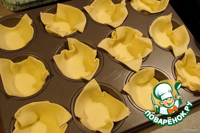 раскладываем фруктово-мучную смесь в подготовленные корзиночки из слоеного теста. Эти были у меня просто с яблоками и орехом