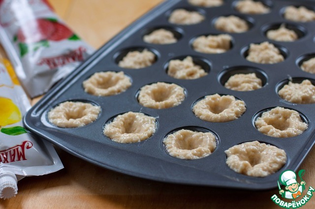 Формочки смазать сливочным маслом, положить в каждую ячейку примерно по 1 ч. л. теста, смочить пальцы водой и сделать углубления, раздвигая тесто по краям, формируя таким образом стенки будущих капкейков. Тесто липкое, довольно вязкое, поэтому углубления быстро теряют свою форму. Лучше всего, конечно, формировать капкейки небольшими партиями.