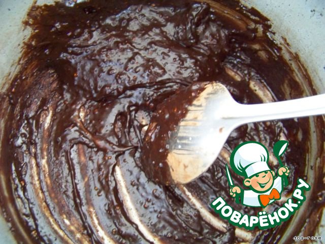 Шоколадку поломаем, добавляем какао, кофе, молоко (я брала чайную ложку сухого молока и чуть больше столовой ложки воды). Все это ставим на огонь, нагреваем и перемешиваем до однородности (примерно за минуту, если не меньше, это все растворяется, у меня шоколад с дробленым орехом, поэтому видны неоднородности).