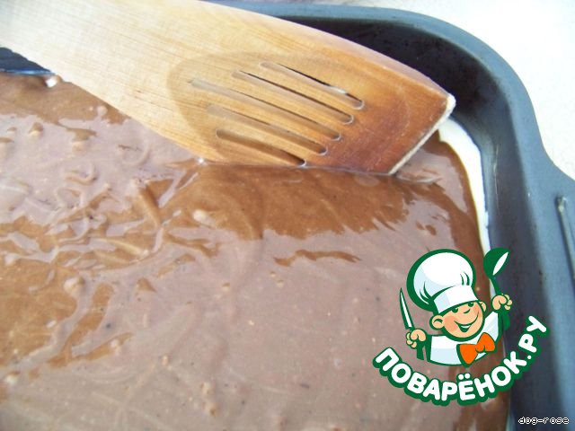 В форму выливаем светлое тесто, поверх темное. Затем лопаткой или ножом проводим несколько полосок почти на всю глубину теста.